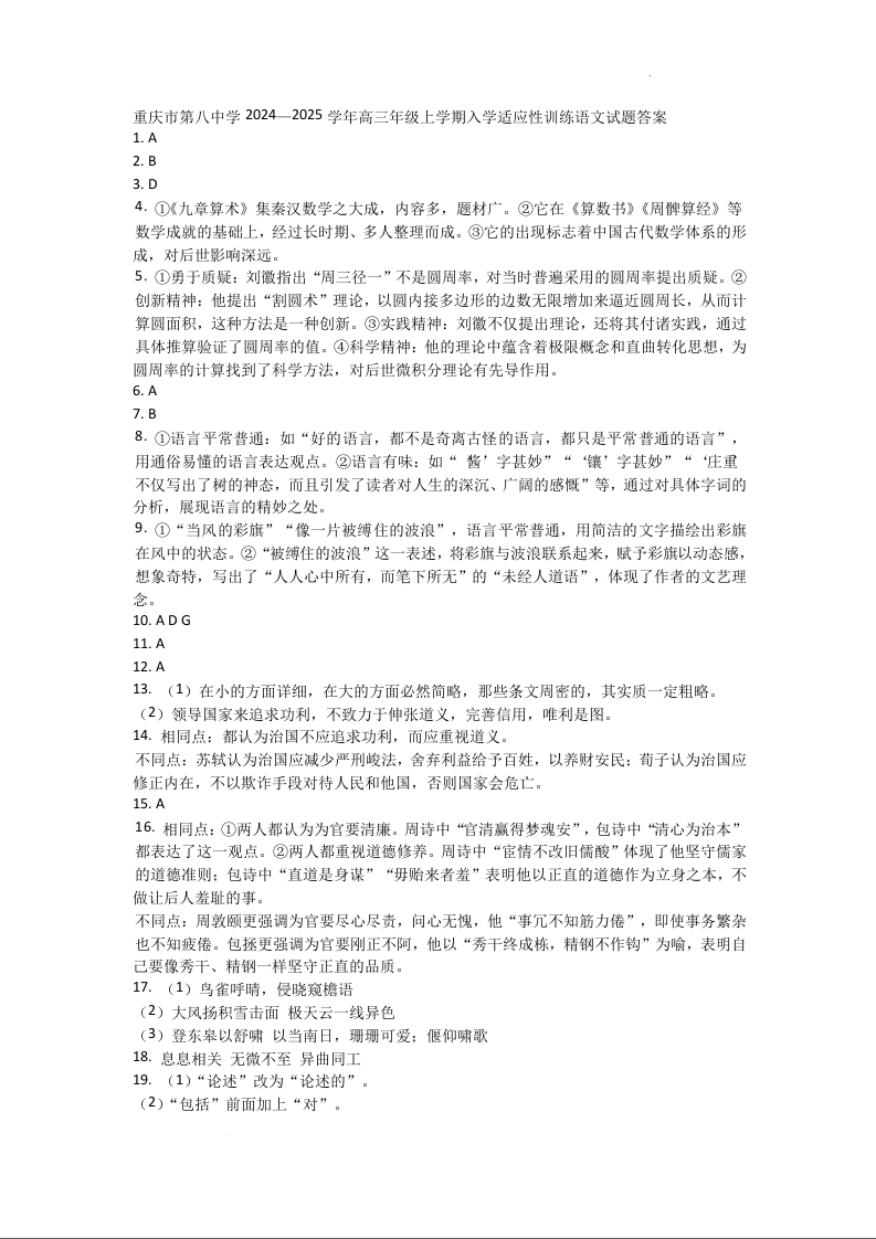 重庆市第八中学2024-2025学年高三上学期入学适应性训练 语文答案