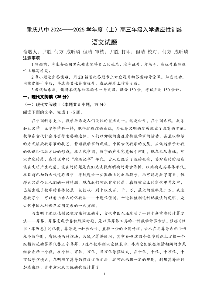 重庆市第八中学2024-2025学年高三上学期入学适应性训练 语文