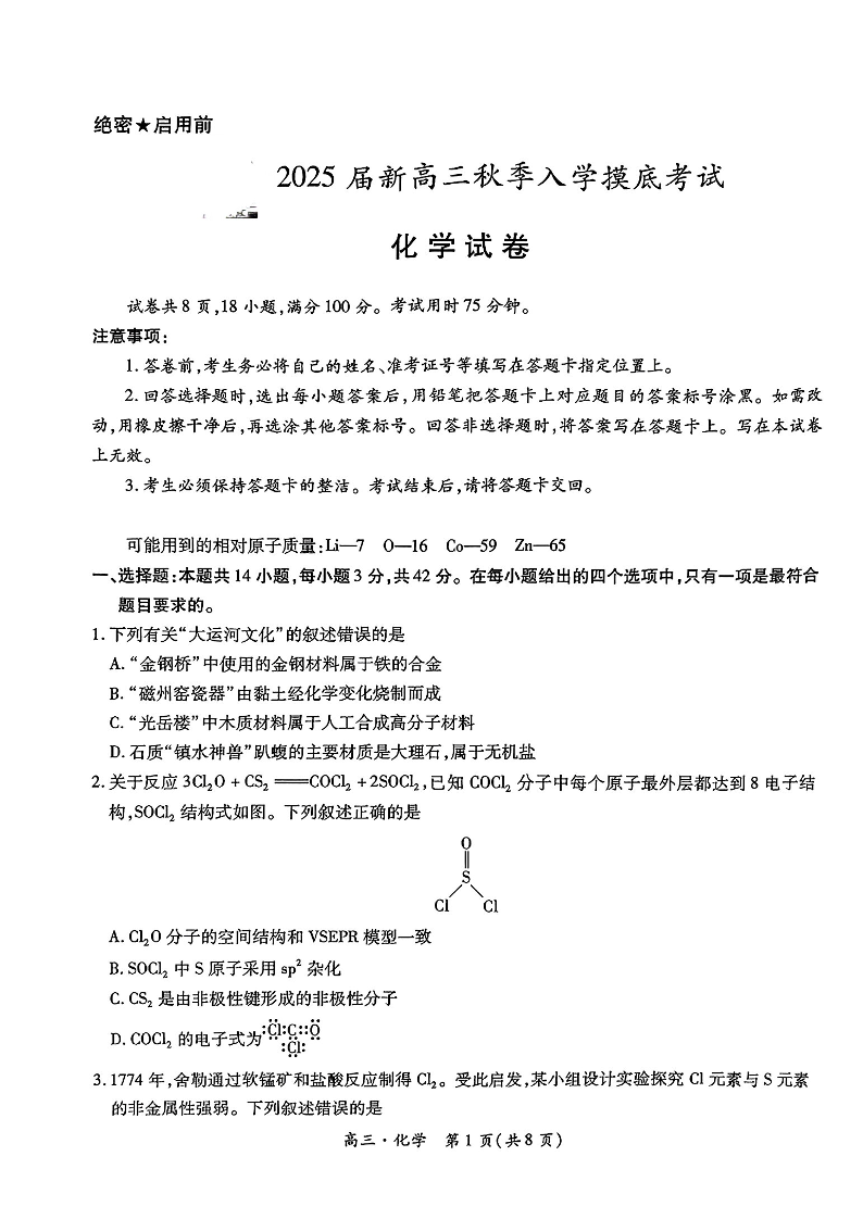 江西省稳派上进2025届新高三秋季入学摸底考试 化学