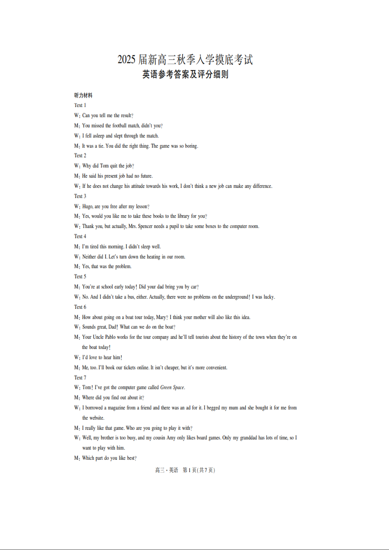 江西省稳派上进2025届新高三秋季入学摸底考试 英语答案