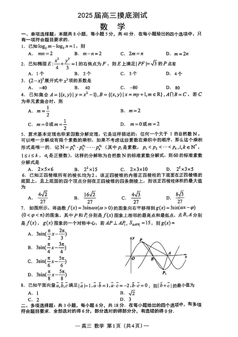 江西省南昌市2025届高三年级摸底测试 数学