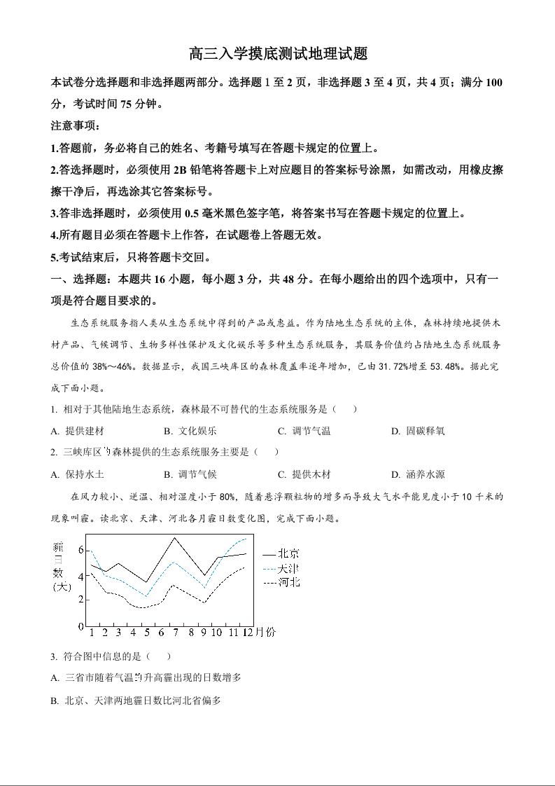 四川省成都列五中学2025届高三入学摸底测试 地理