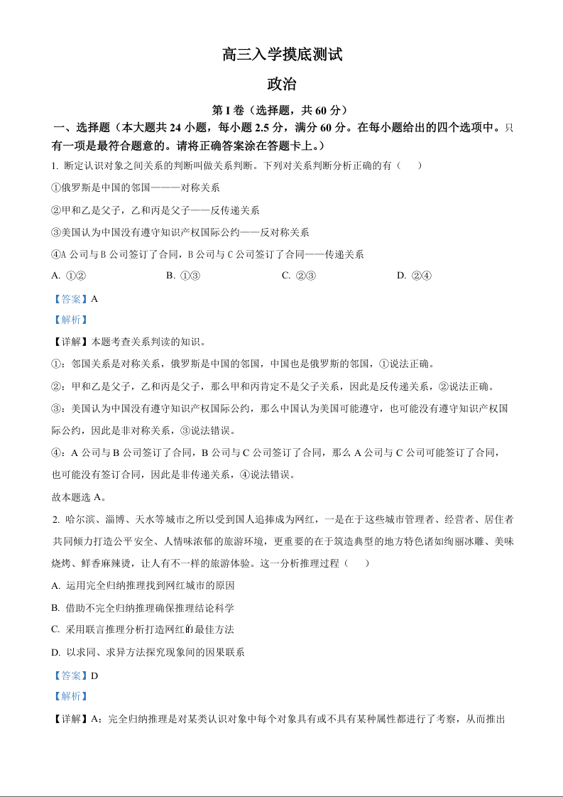 四川省成都列五中学2025届高三入学摸底测试 政治答案
