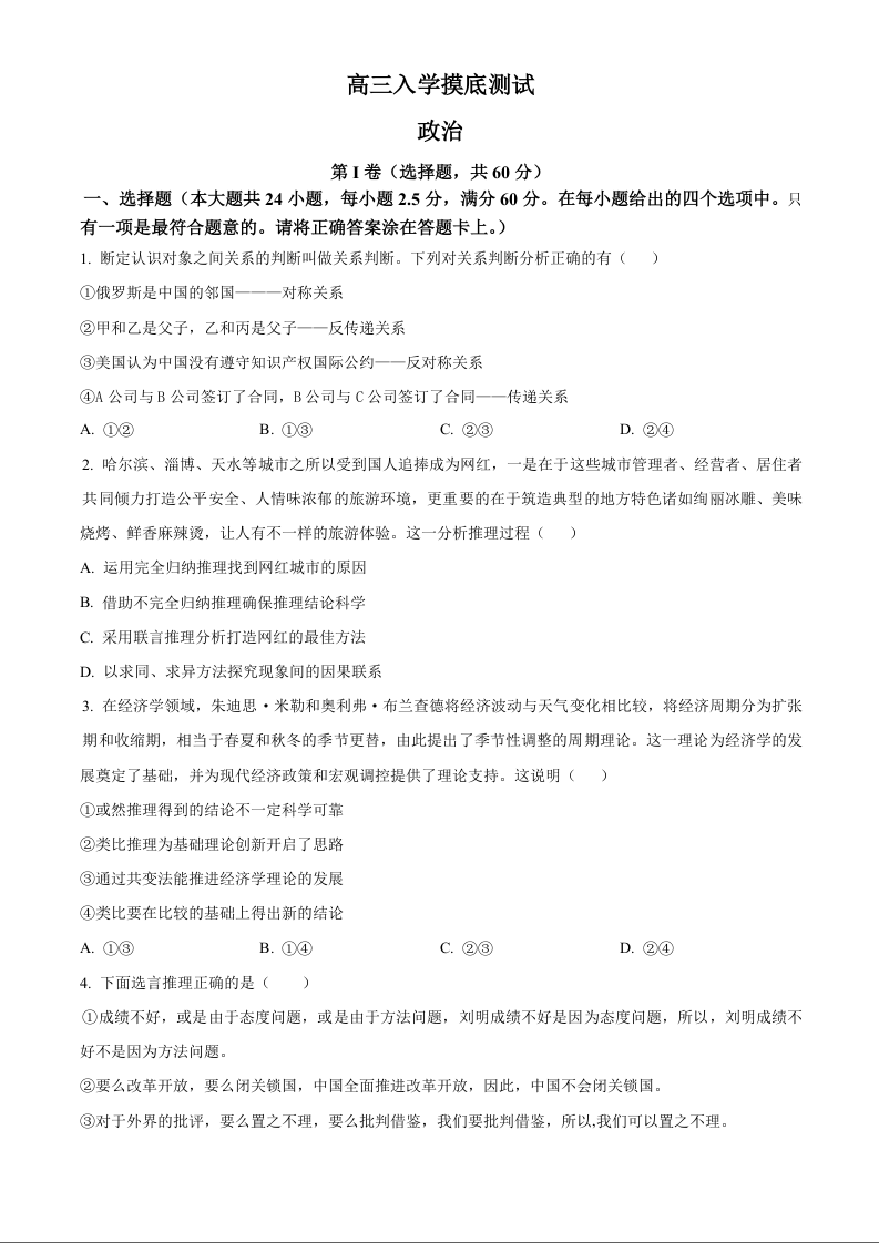 四川省成都列五中学2025届高三入学摸底测试 政治