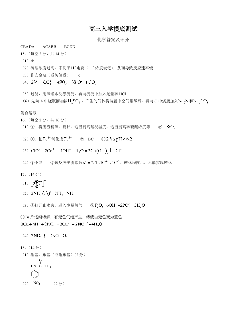四川省成都列五中学2025届高三入学摸底测试 化学答案