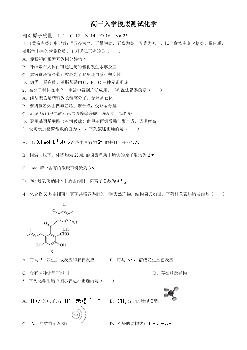 四川省成都列五中学2025届高三入学摸底测试 化学