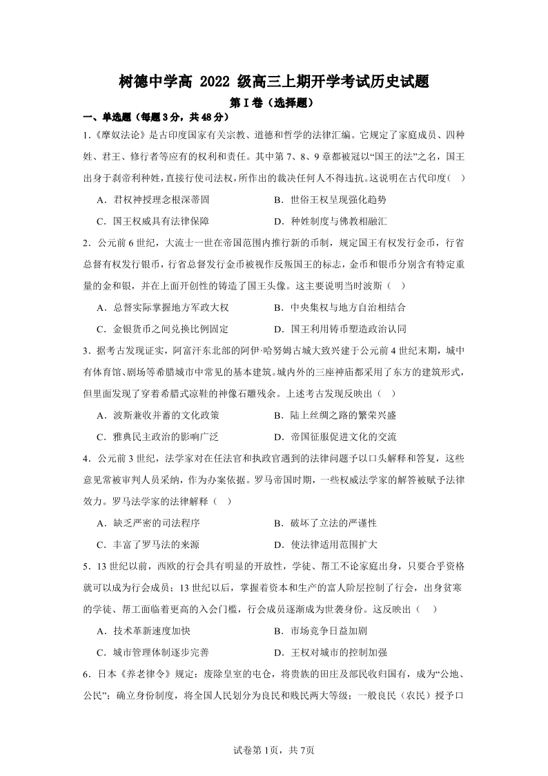 四川省成都市树德中学2024-2025学年高三上学期开学考试 历史