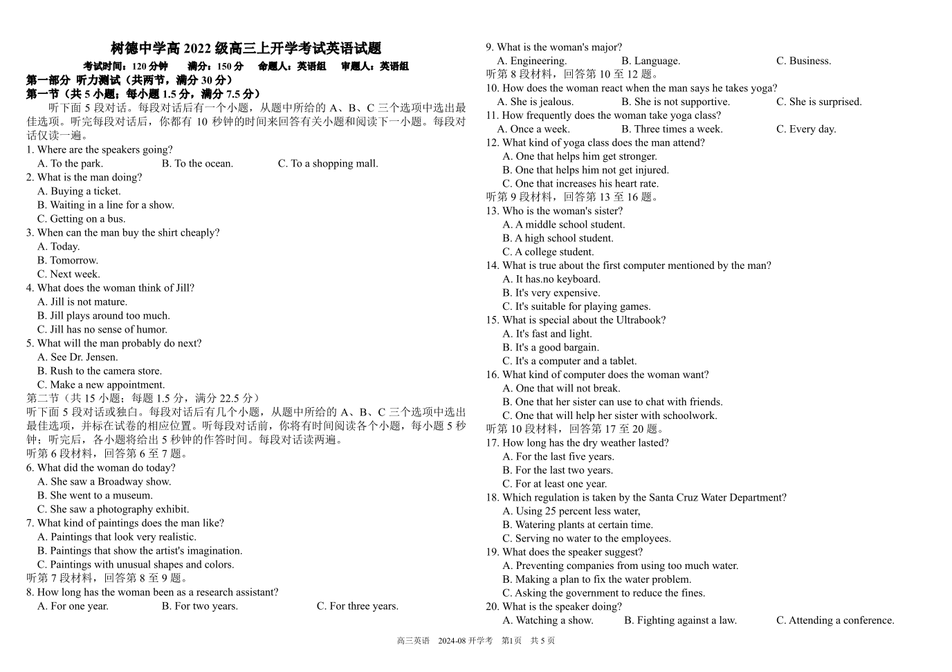 四川省成都市树德中学2024-2025学年高三上学期开学考试 英语