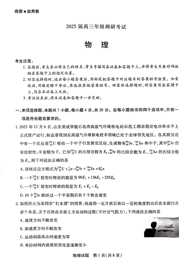 河南省天一大联考2025届高三年级9月调研考试 物理