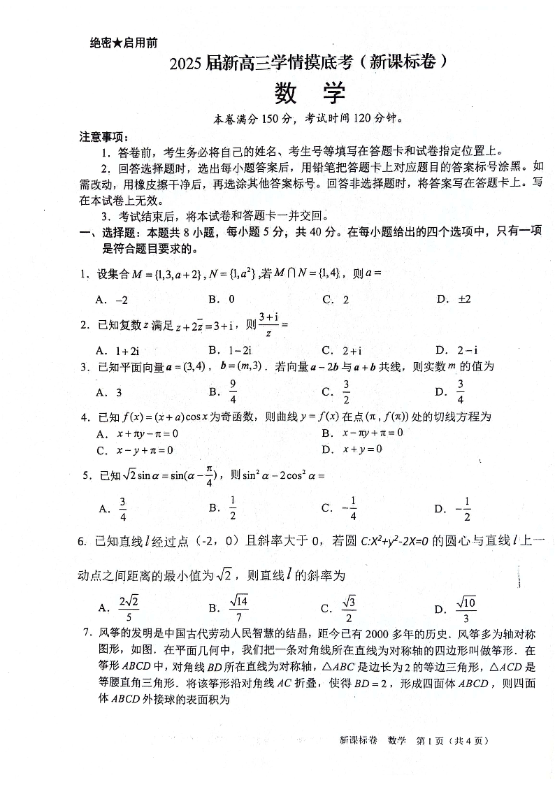 陕西省安康市2025届新高三学情摸底考 数学