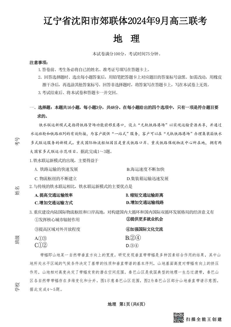 辽宁省沈阳市郊联体2024年9月新高三9月开学联考 地理