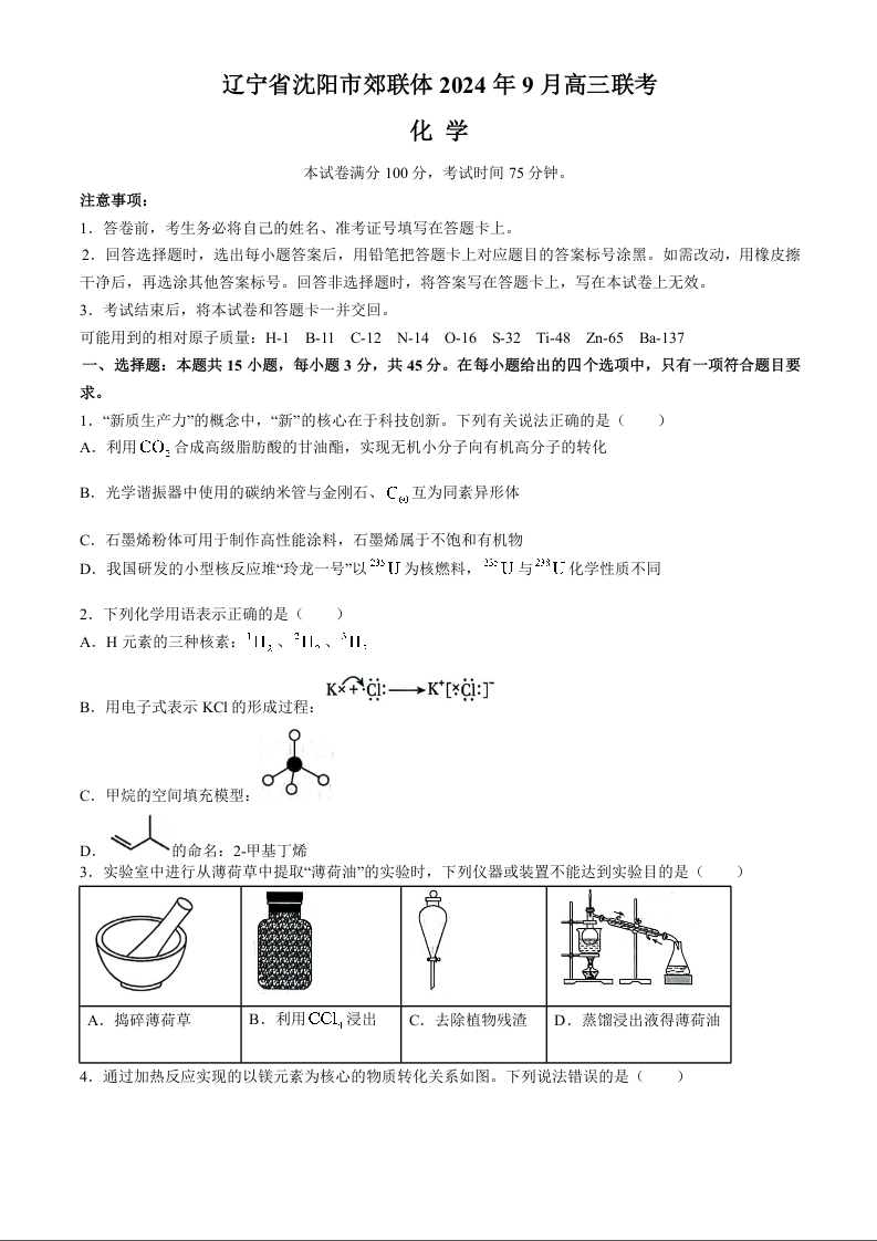 辽宁省沈阳市郊联体2024年9月新高三9月开学联考 化学