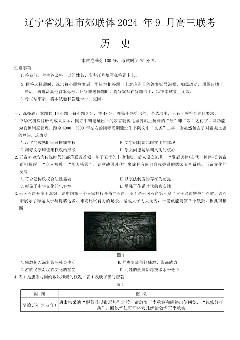 辽宁省沈阳市郊联体2024年9月新高三9月开学联考 历史
