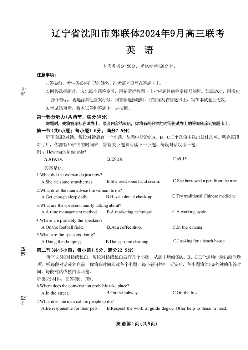 辽宁省沈阳市郊联体2024年9月新高三9月开学联考 英语