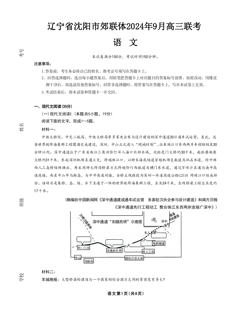 辽宁省沈阳市郊联体2024年9月新高三9月开学联考 语文