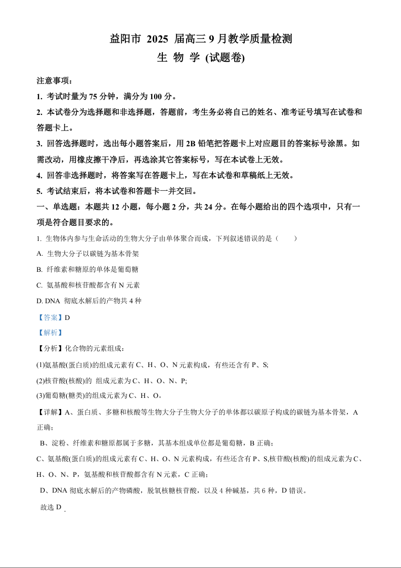 湖南省益阳市2025届高三9月教学质量检测 生物答案