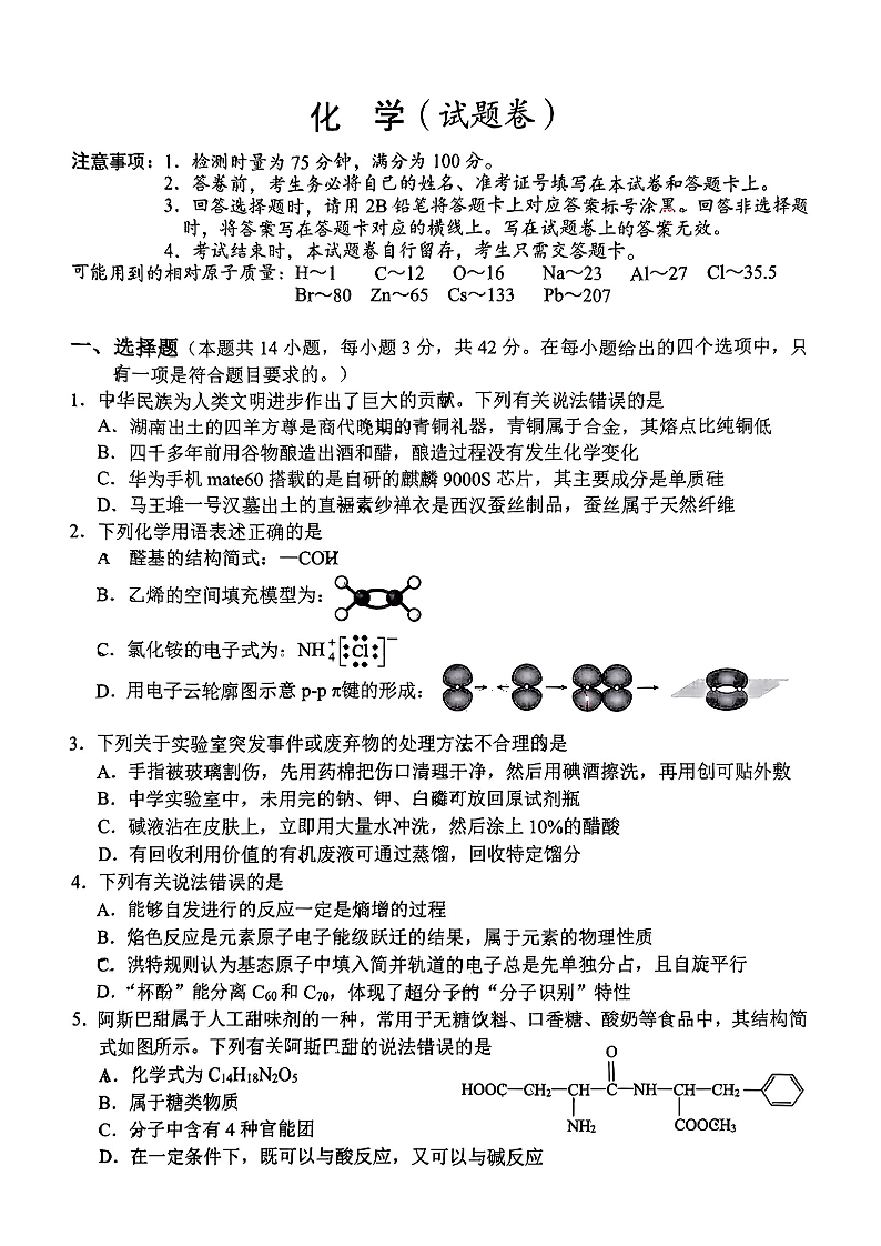 湖南省益阳市2025届高三9月教学质量检测 化学