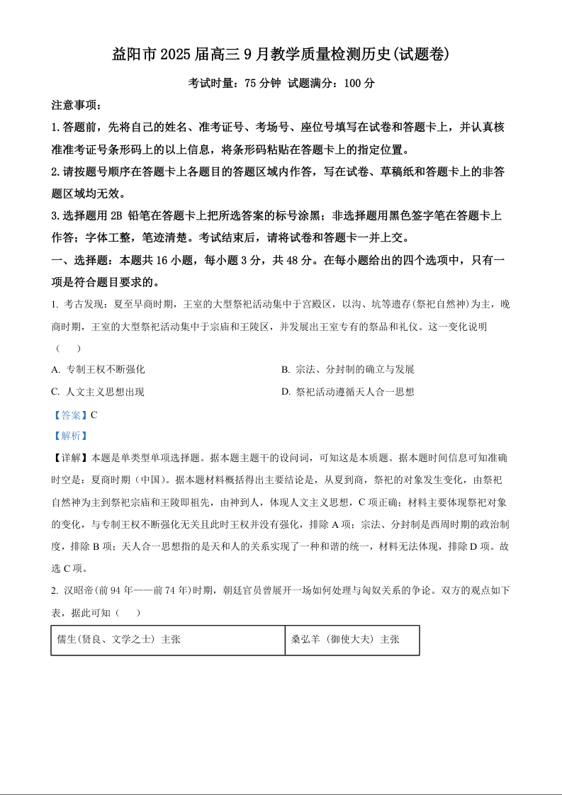 湖南省益阳市2025届高三9月教学质量检测 历史答案