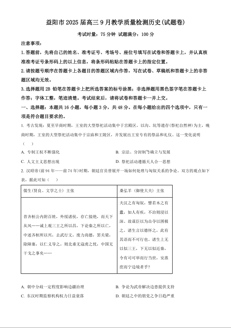 湖南省益阳市2025届高三9月教学质量检测 历史