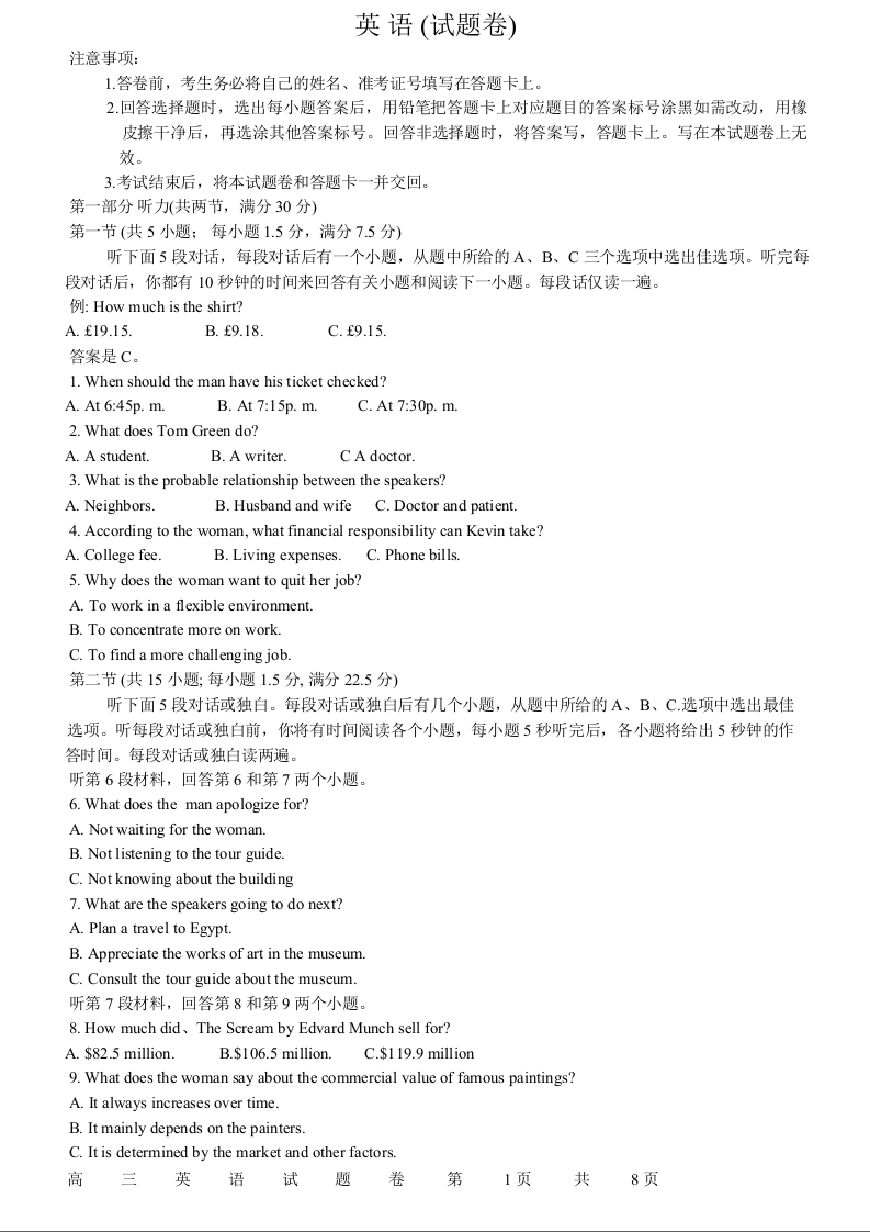湖南省益阳市2025届高三9月教学质量检测 英语