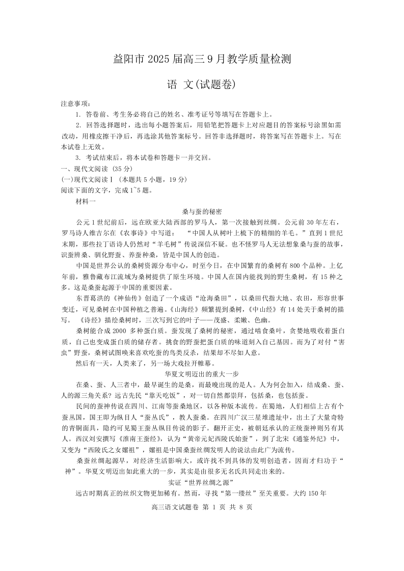 湖南省益阳市2025届高三9月教学质量检测 语文