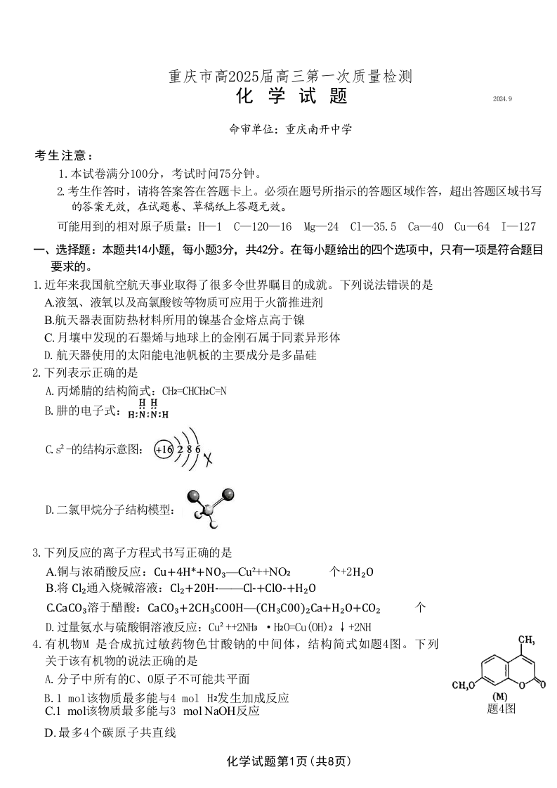 重庆市南开中学高2025届高三第一次质量检测 化学