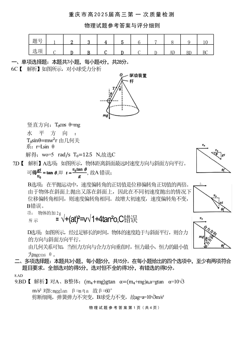 重庆市南开中学高2025届高三第一次质量检测 物理答案
