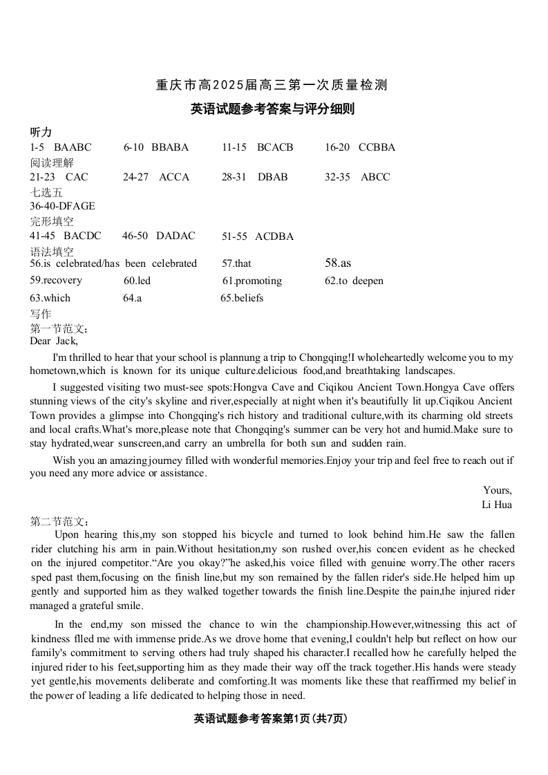重庆市南开中学高2025届高三第一次质量检测 英语答案