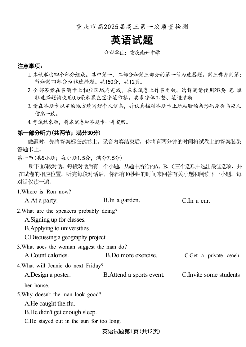 重庆市南开中学高2025届高三第一次质量检测 英语