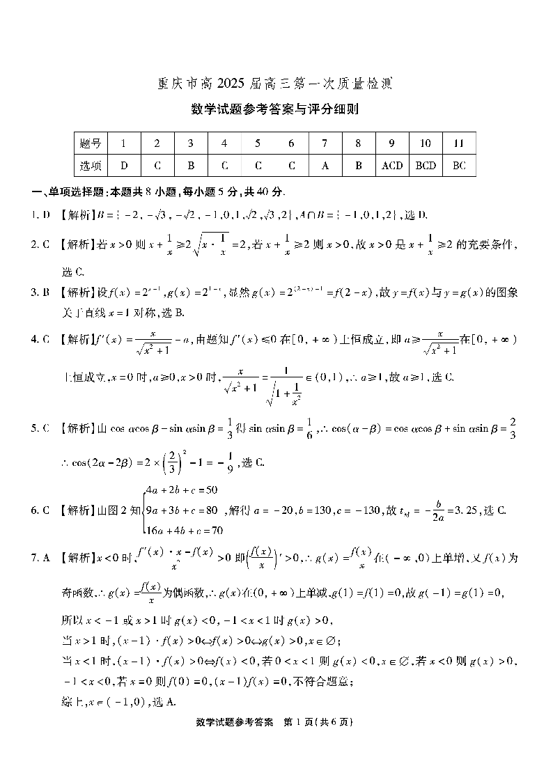 重庆市南开中学高2025届高三第一次质量检测 数学答案