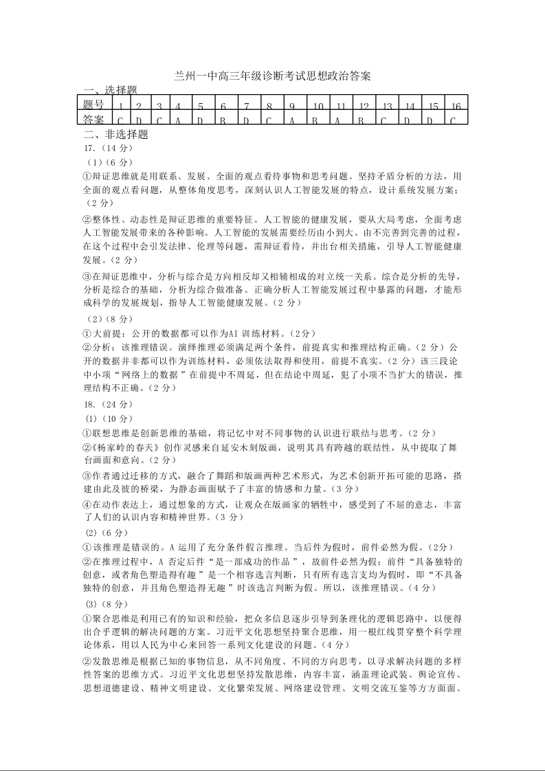 甘肃省兰州第一中学2024-2025学年高三9月诊断考试 政治参考答案