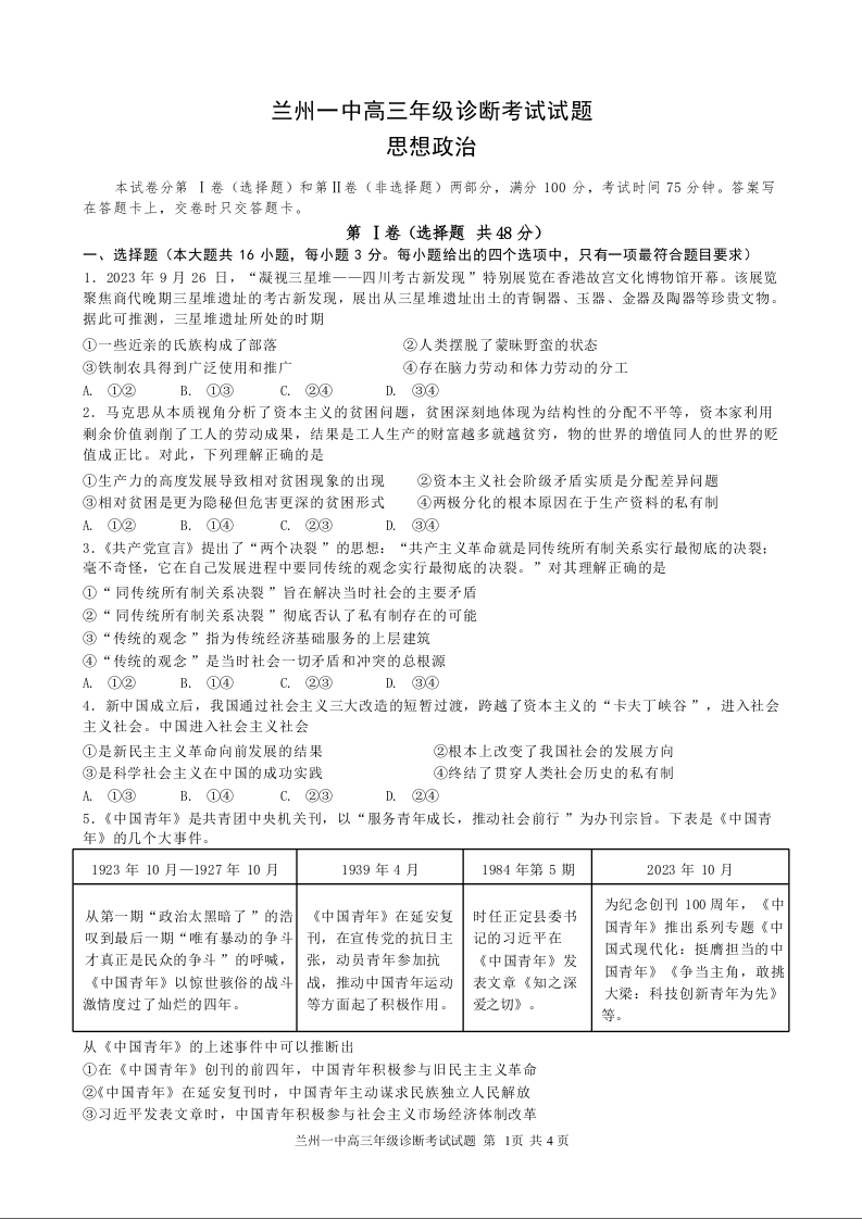 甘肃省兰州第一中学2024-2025学年高三9月诊断考试 政治