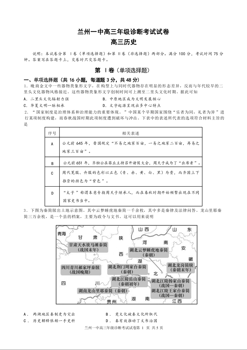 甘肃省兰州第一中学2024-2025学年高三9月诊断考试 历史