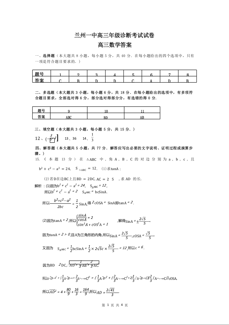 甘肃省兰州第一中学2024-2025学年高三9月诊断考试 数学参考答案
