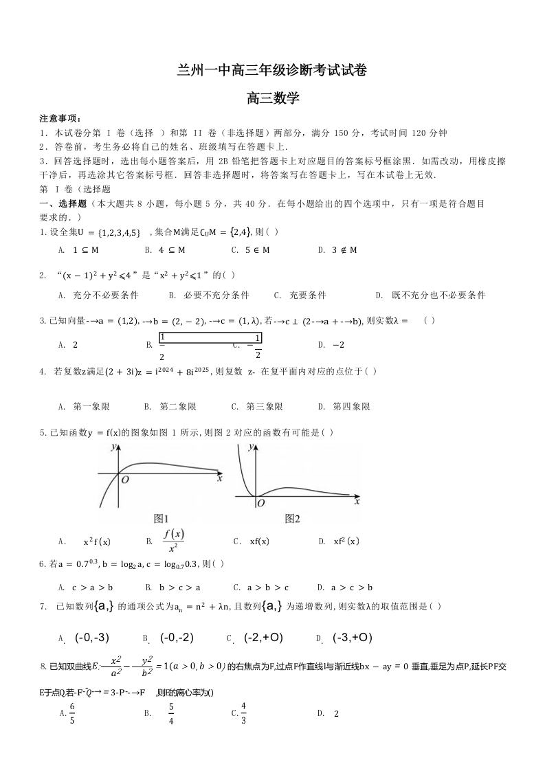 甘肃省兰州第一中学2024-2025学年高三9月诊断考试 数学