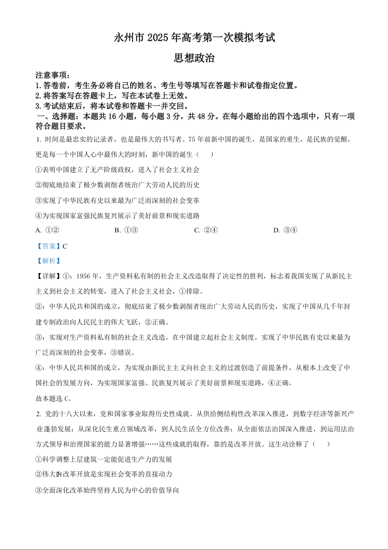 湖南省永州市2025年高考第一次模拟考试 政治答案