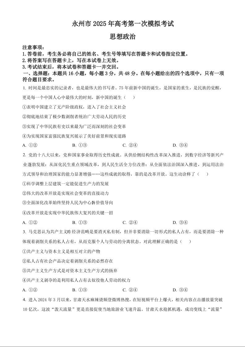 湖南省永州市2025年高考第一次模拟考试 政治