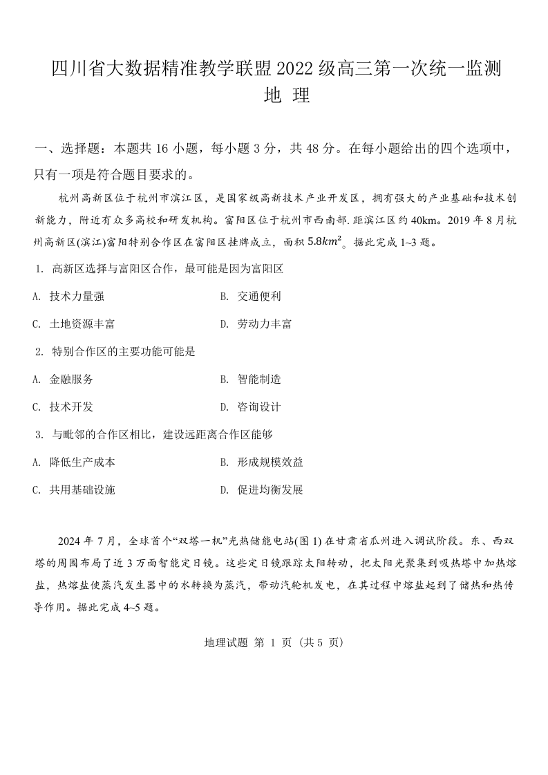 四川省大数据精准教学联盟2022级高三第一次统一监测 地理