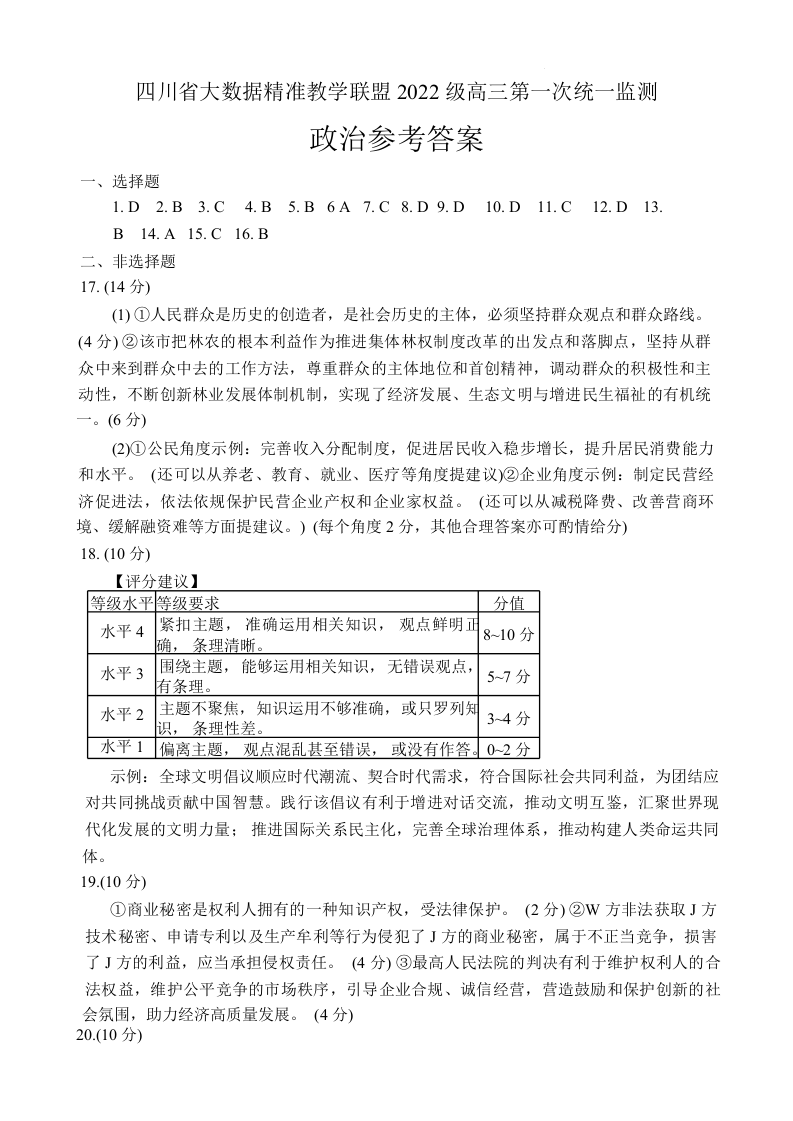 四川省大数据精准教学联盟2022级高三第一次统一监测 政治答案