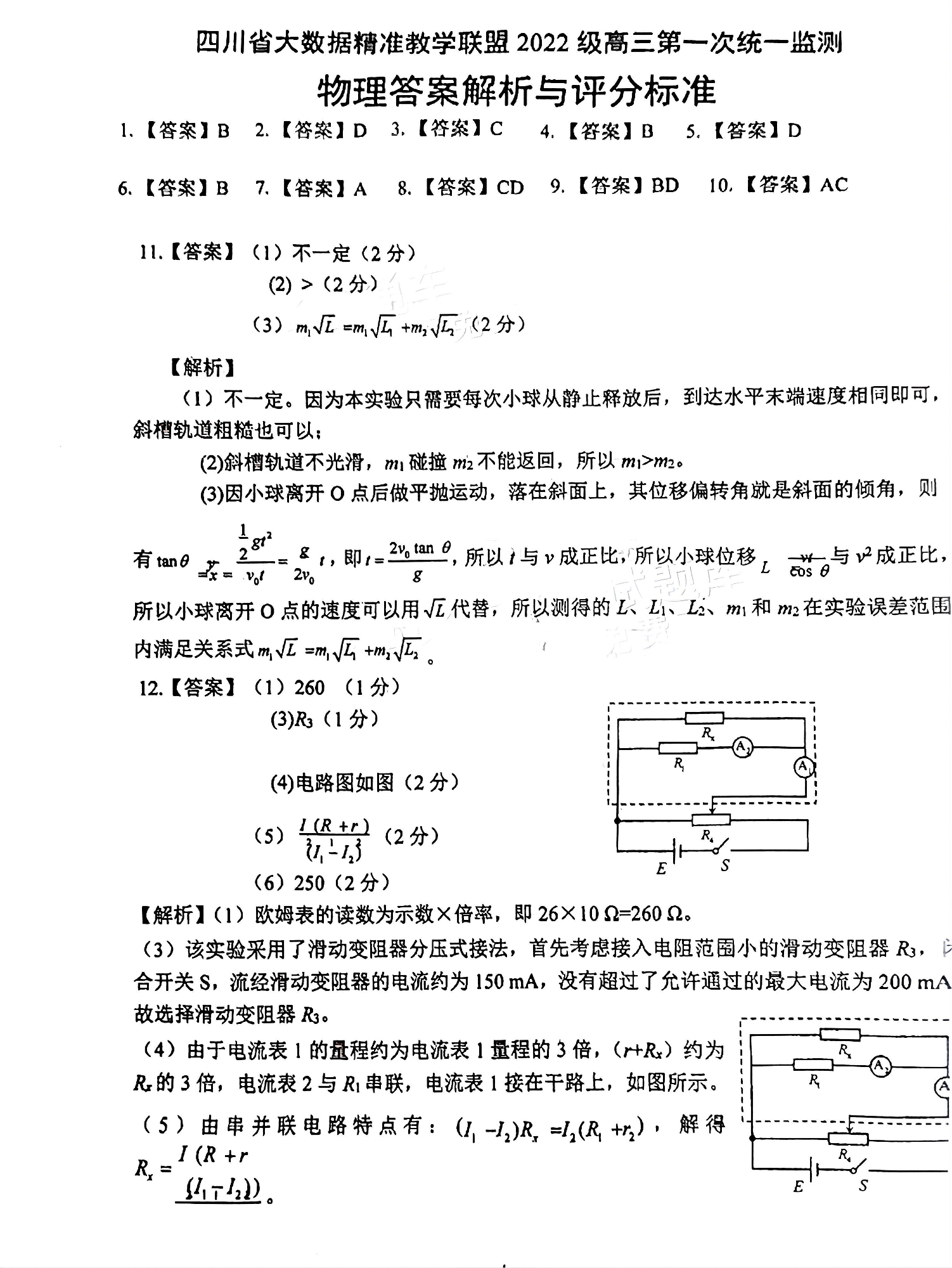四川省大数据精准教学联盟2022级高三第一次统一监测 物理答案