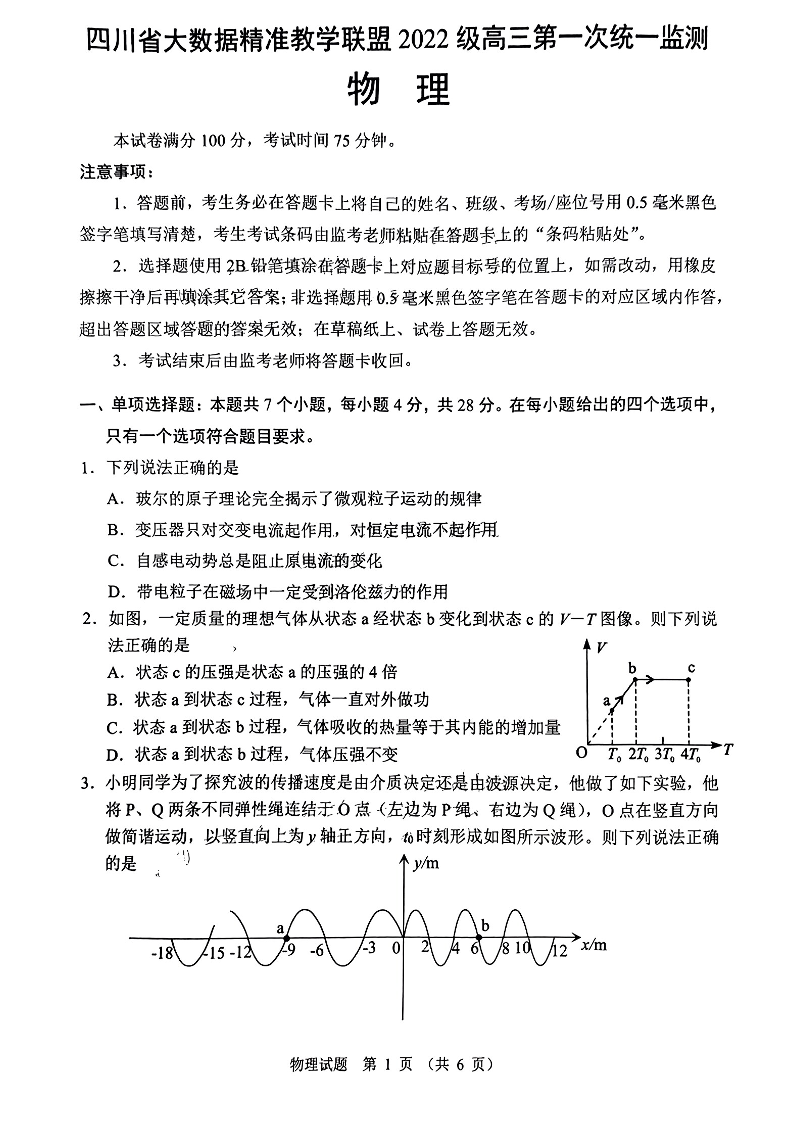 四川省大数据精准教学联盟2022级高三第一次统一监测 物理