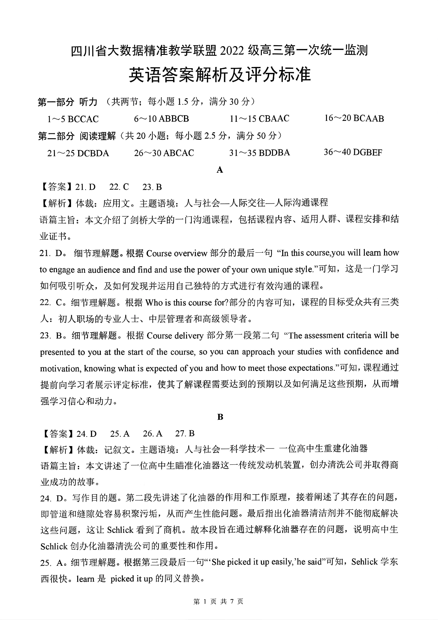 四川省大数据精准教学联盟2022级高三第一次统一监测 英语答案