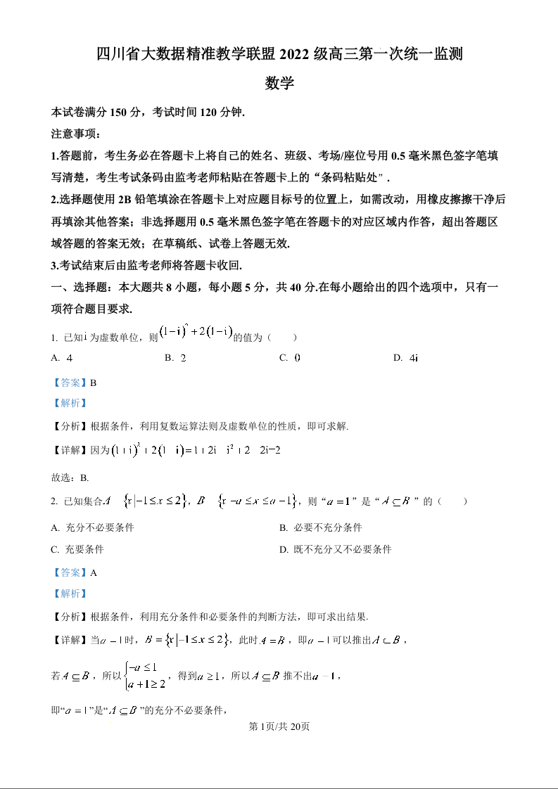 四川省大数据精准教学联盟2022级高三第一次统一监测 数学答案