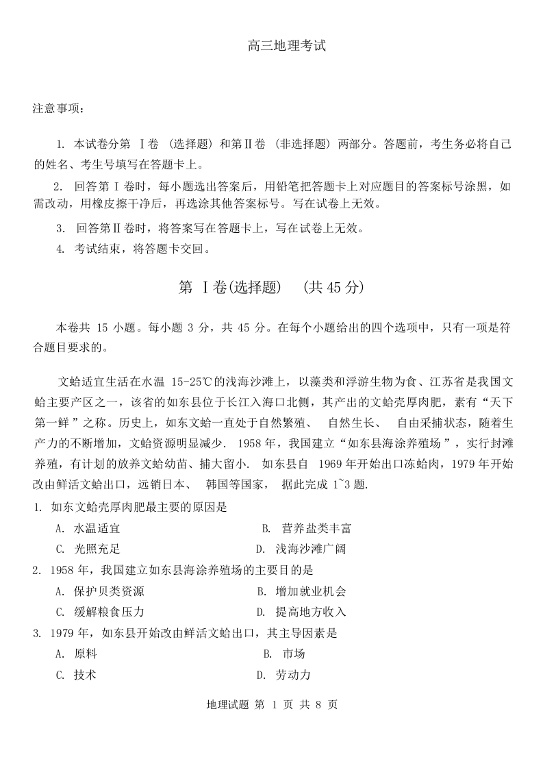 山东省青岛市2024年高三年级9月期初调研检测 地理