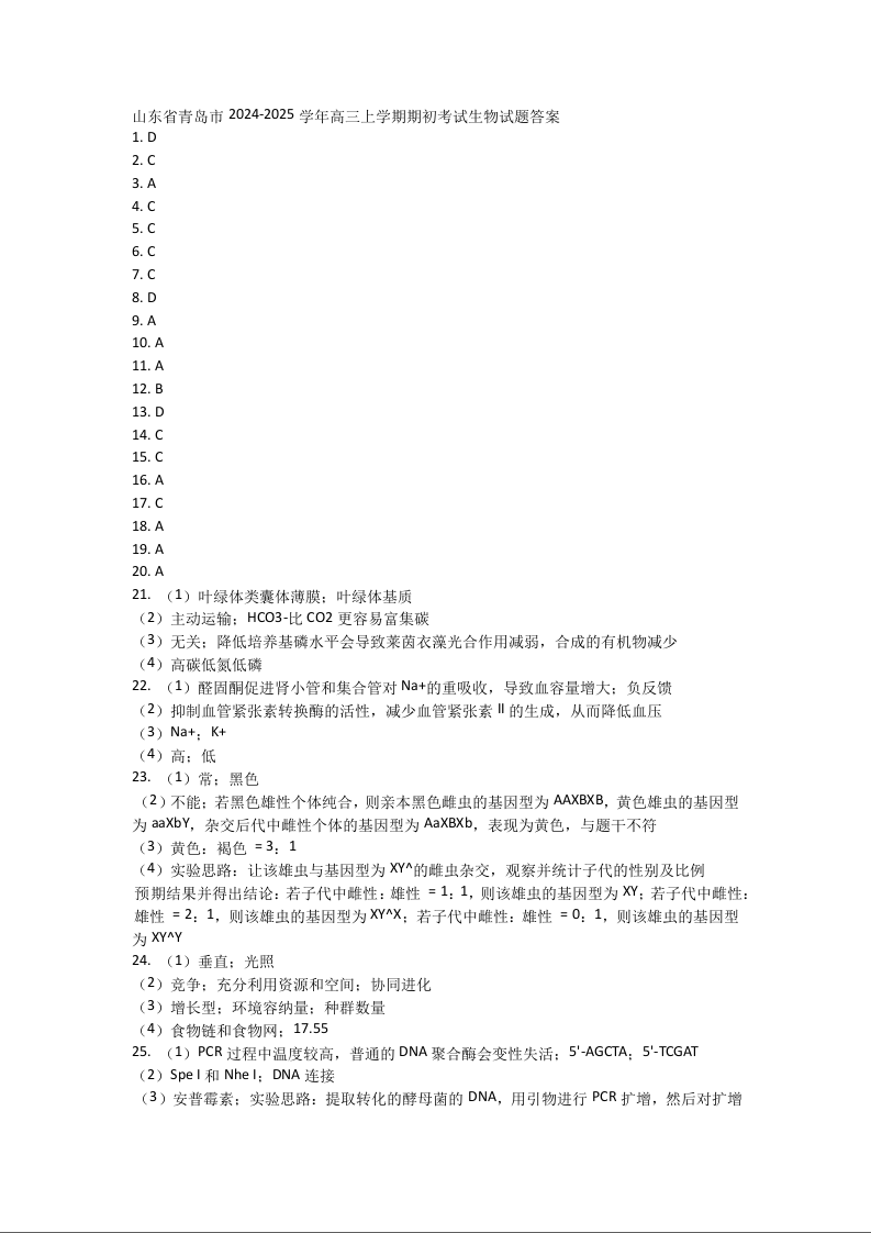 山东省青岛市2024年高三年级9月期初调研检测 生物答案