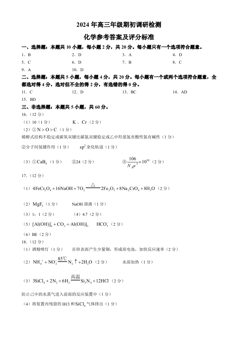 山东省青岛市2024年高三年级9月期初调研检测 化学答案