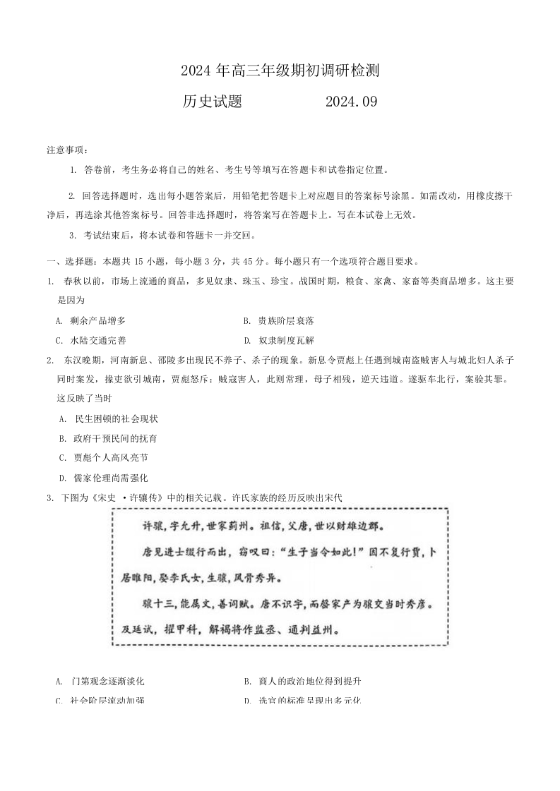 山东省青岛市2024年高三年级9月期初调研检测 历史