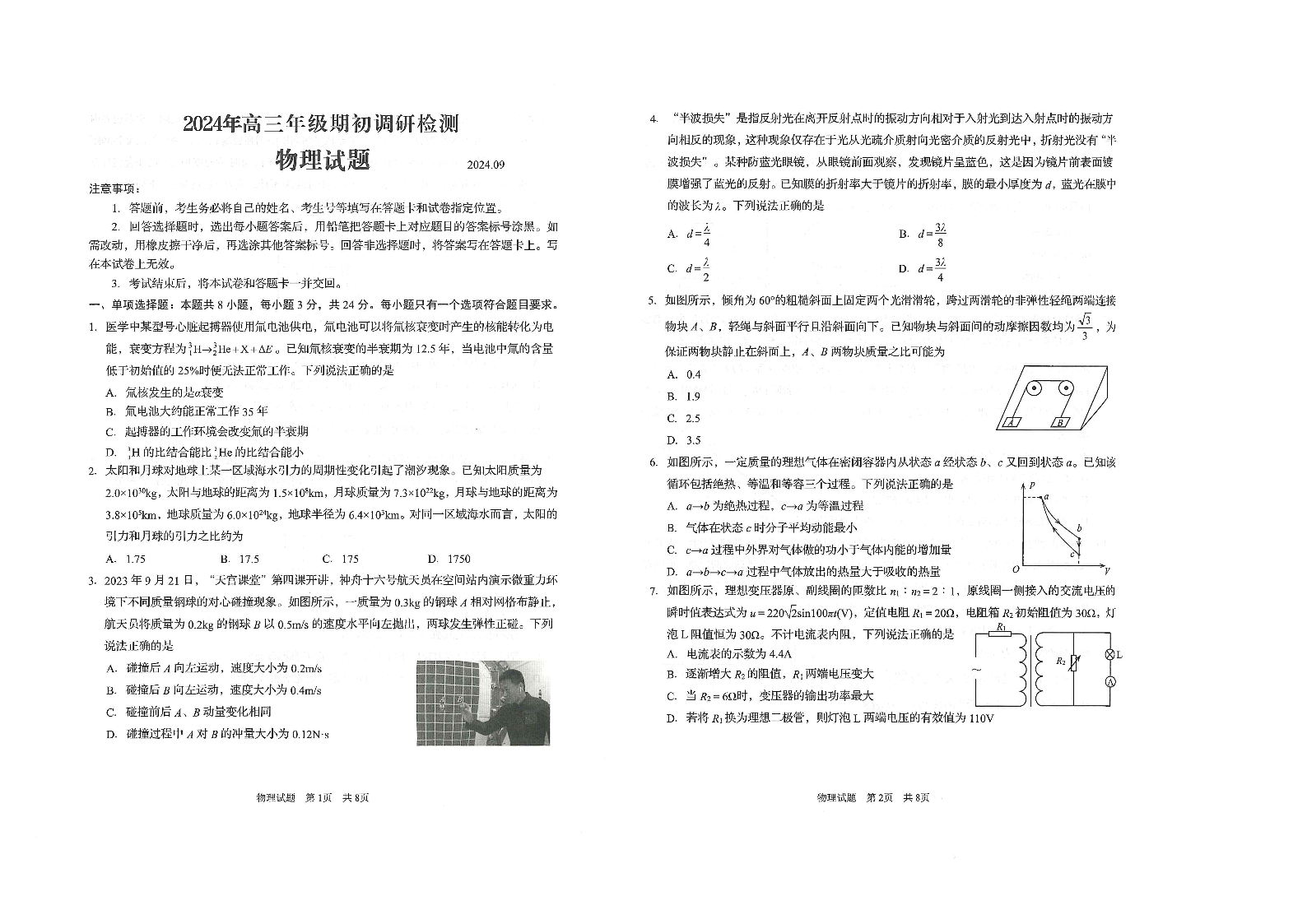 山东省青岛市2024年高三年级9月期初调研检测 物理