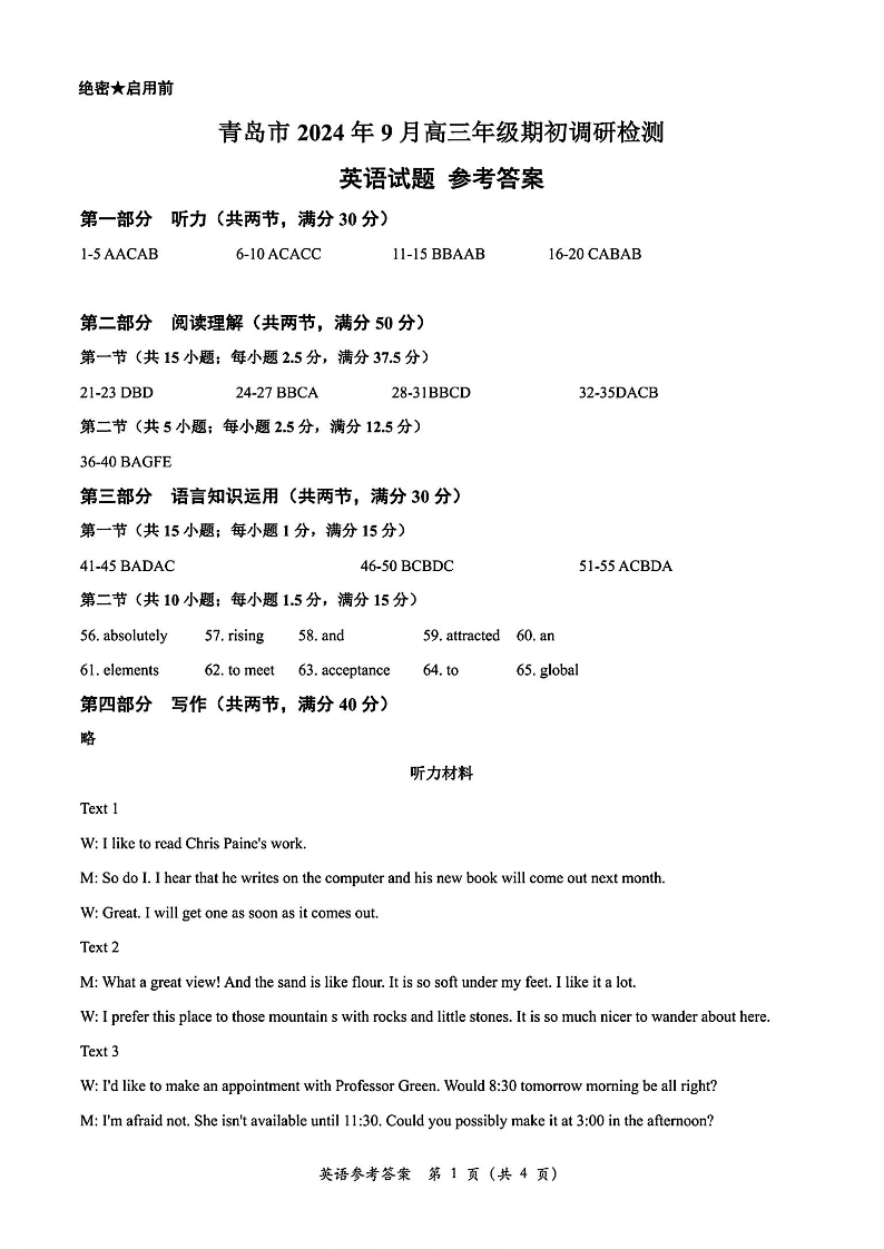 山东省青岛市2024年高三年级9月期初调研检测 英语答案