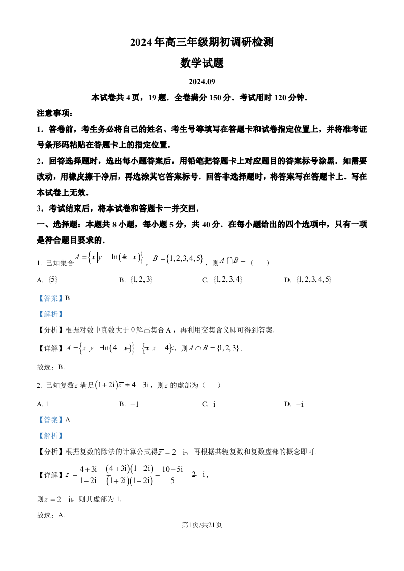 山东省青岛市2024年高三年级9月期初调研检测 数学答案